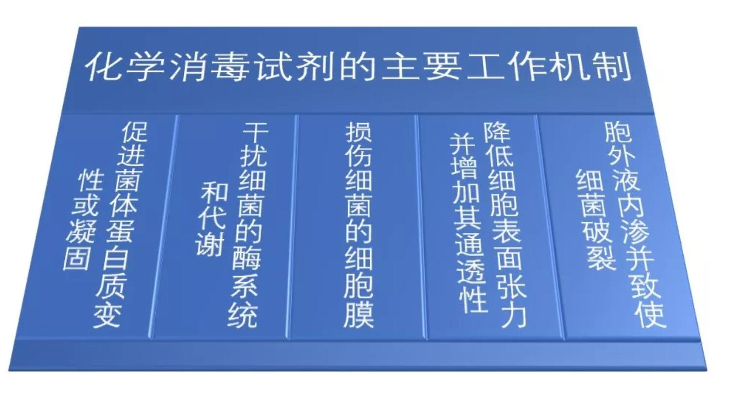 化學(xué)消毒試劑能夠影響細(xì)菌的化學(xué)組成、物理結(jié)構(gòu)和生理活動(dòng),從而發(fā)揮消毒或滅菌的作用?;瘜W(xué)消毒試劑的工作機(jī)制主要包括促進(jìn)菌體蛋白質(zhì)變性或凝固、干擾細(xì)菌的酶系統(tǒng)和代謝、損傷細(xì)菌的細(xì)胞膜、降低細(xì)胞表面張力并增加其通透性、胞外液內(nèi)滲并致使細(xì)菌破裂等。