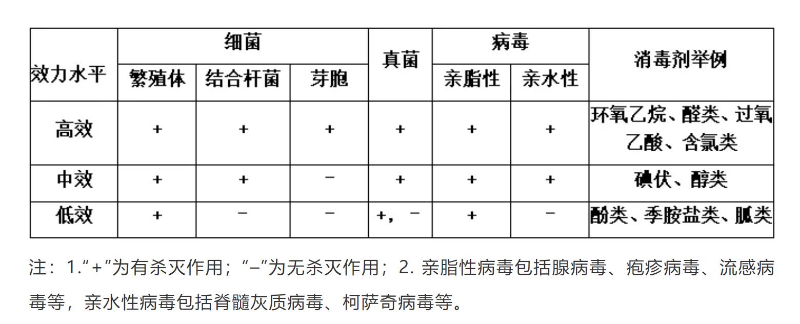 根據(jù)其對(duì)微生物的殺滅作用可分為高效、中效、低效三類。各類化學(xué)消毒劑的效力水平見下表。
