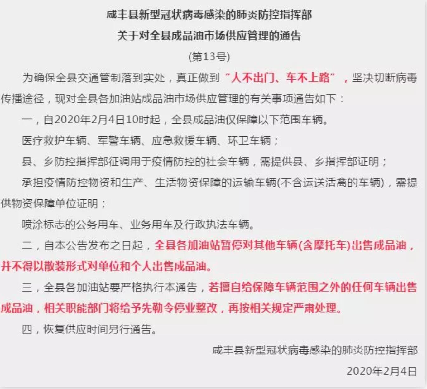 2月4日湖北省恩施土家族苗族自治州咸豐縣新型冠狀病毒感染的肺炎疫情防控指揮部發(fā)布的最新通告顯示,該縣從4日上午10時起,對4類車輛以外的普通車輛及個人,實行“斷油”措施。