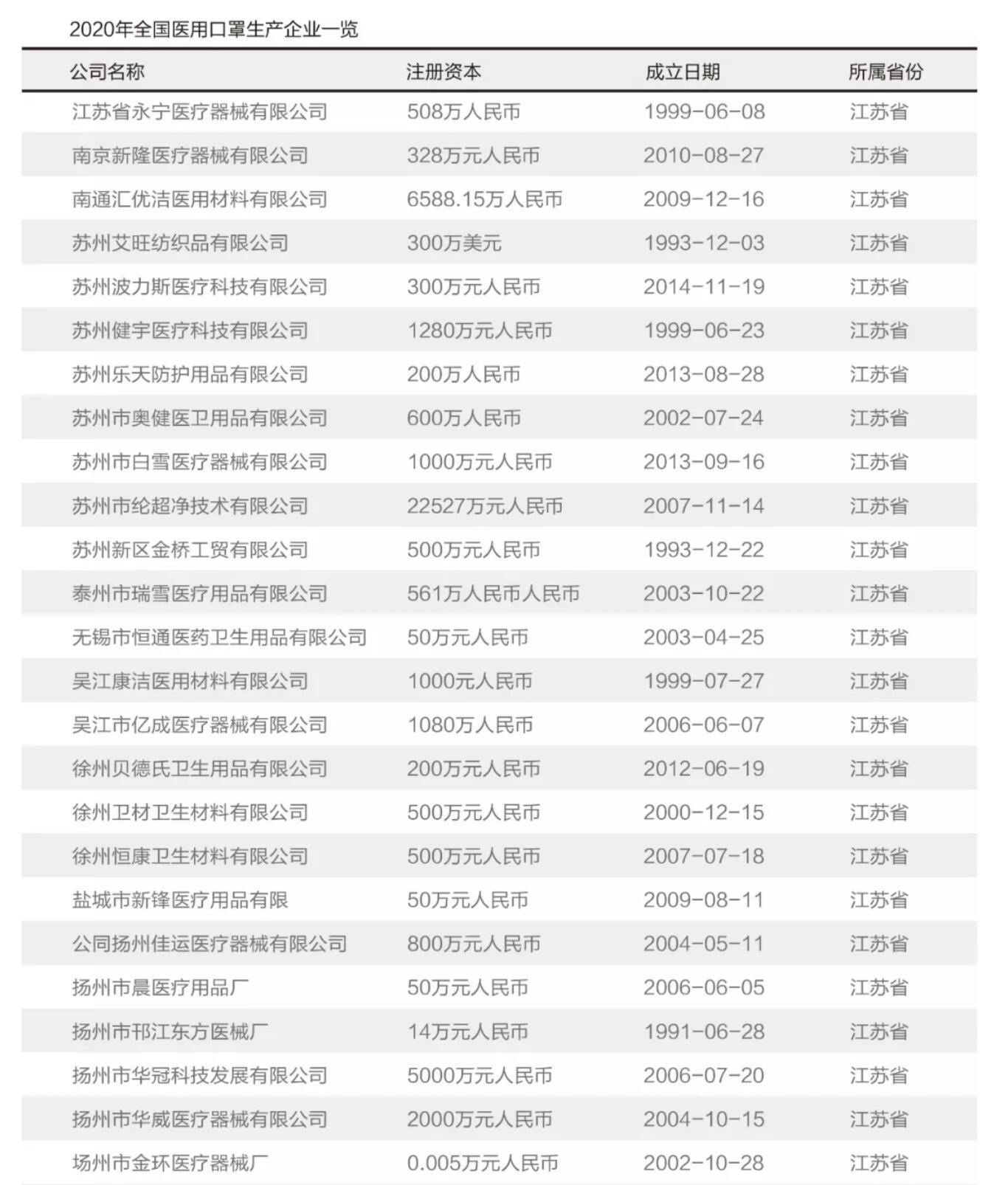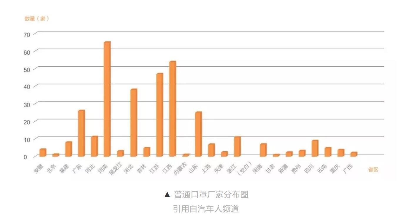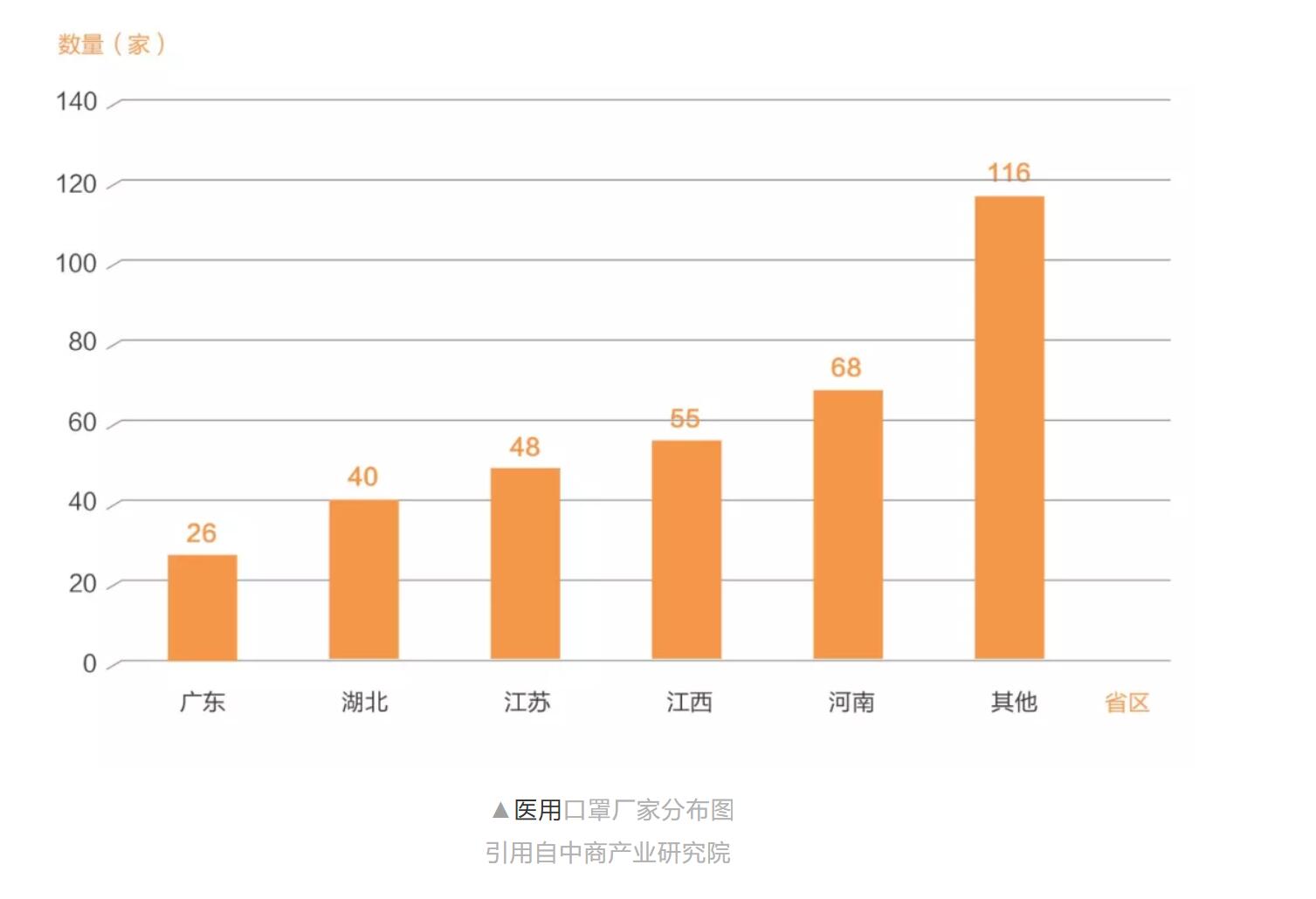中國是一個口罩產(chǎn)業(yè)大國,生產(chǎn)了全球約50%的口罩。在疫情發(fā)生之前,中國口罩最高日產(chǎn)為2000多萬只。數(shù)據(jù)顯示,2015-2019年中國大陸地區(qū)口罩產(chǎn)業(yè)產(chǎn)值增長率在10%以上。2019年,中國大陸地區(qū)口罩產(chǎn)量超過50億只,產(chǎn)值高達(dá)102.35億元。最快的口罩生產(chǎn)速度120-200只/秒,但一個解析消毒的標(biāo)準(zhǔn)流程卻需要7天到半個月。因?yàn)獒t(yī)用口罩采用環(huán)氧乙烷滅菌,滅菌后,口罩上會有環(huán)氧乙烷殘留,不但刺激呼吸道,還有致癌物。這樣一來,就必須通過解析方式,使殘留的環(huán)氧乙烷釋放,達(dá)到安全含量標(biāo)準(zhǔn),經(jīng)檢測合格后,才能出廠上市。下圖為普通及醫(yī)療口罩生產(chǎn)廠家分布圖。