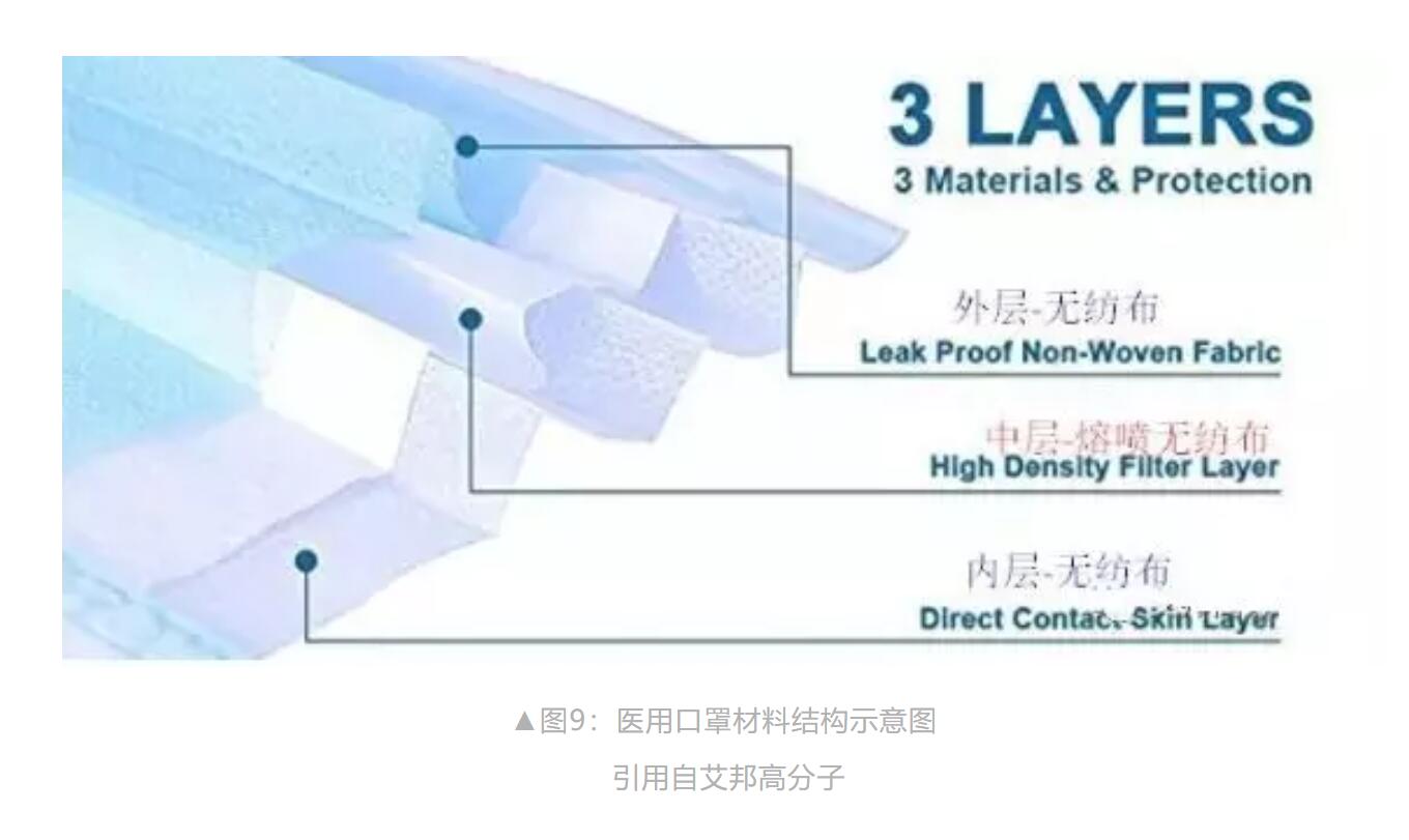 醫(yī)用外科口罩一般是由三層無(wú)紡布制成,如圖8所示。材料是紡粘無(wú)紡布+熔噴無(wú)紡布+紡粘無(wú)紡布(如圖9),起過(guò)濾效果的主要部分是極細(xì)密且?guī)ъo電的內(nèi)層過(guò)濾布——熔噴無(wú)紡布,它的主要材質(zhì)是高熔指聚丙烯,經(jīng)過(guò)靜電駐極處理后達(dá)到所要求的過(guò)濾效率。