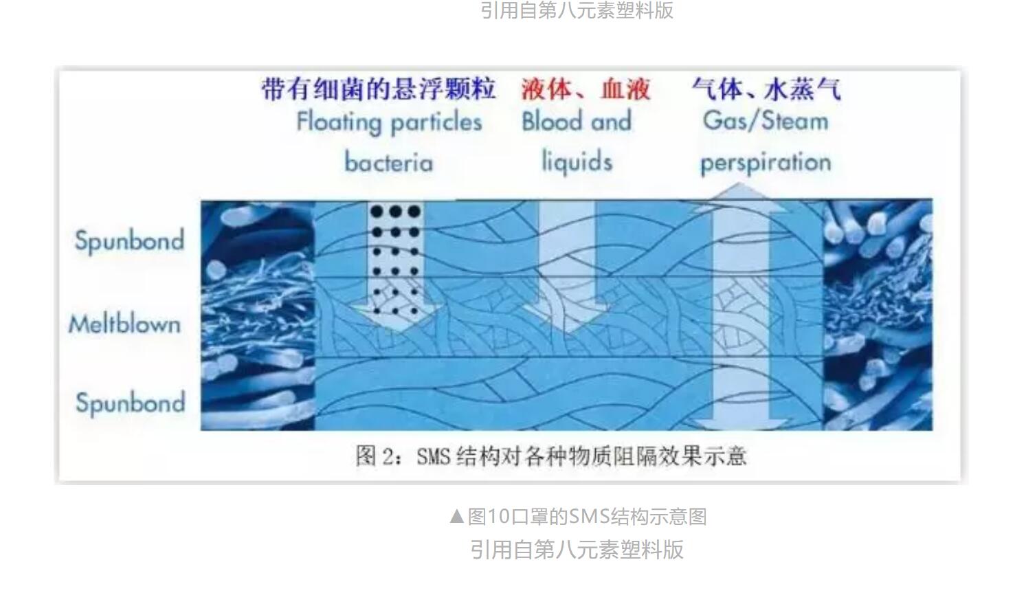 這里面紡粘層其纖維直徑比較粗,在20微米左右,2層S紡粘層主要作用是支撐整個(gè)無(wú)紡布結(jié)構(gòu),對(duì)阻隔并沒(méi)有太大的作用??谡掷锩孀钪匾氖亲韪魧蛹慈蹏妼樱蹏妼拥睦w維直徑比較細(xì),在2微米左右,所以只有紡粘層直徑的十分之一,這個(gè)對(duì)防止細(xì)菌、血液滲透起至關(guān)重要的作用,經(jīng)過(guò)靜電處理后達(dá)到所要求的過(guò)濾效率。如果S紡粘層過(guò)多,口罩就比較硬,而熔噴層M過(guò)多,則呼吸比較困難,所以從口罩呼吸的難易程度可以判斷口罩的隔絕效果,呼吸越困難,則阻隔效果更好,但是,如果M層變?yōu)楸∧?,就基本上不能呼吸了,病毒是阻隔了,人也快不行了,所以,這也是一個(gè)技術(shù)問(wèn)題。